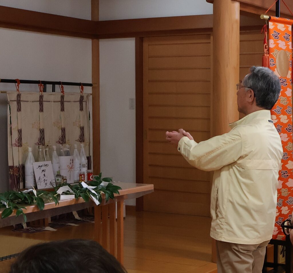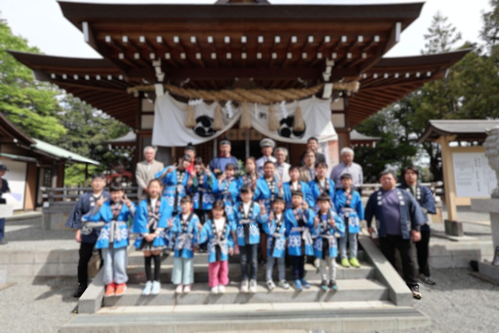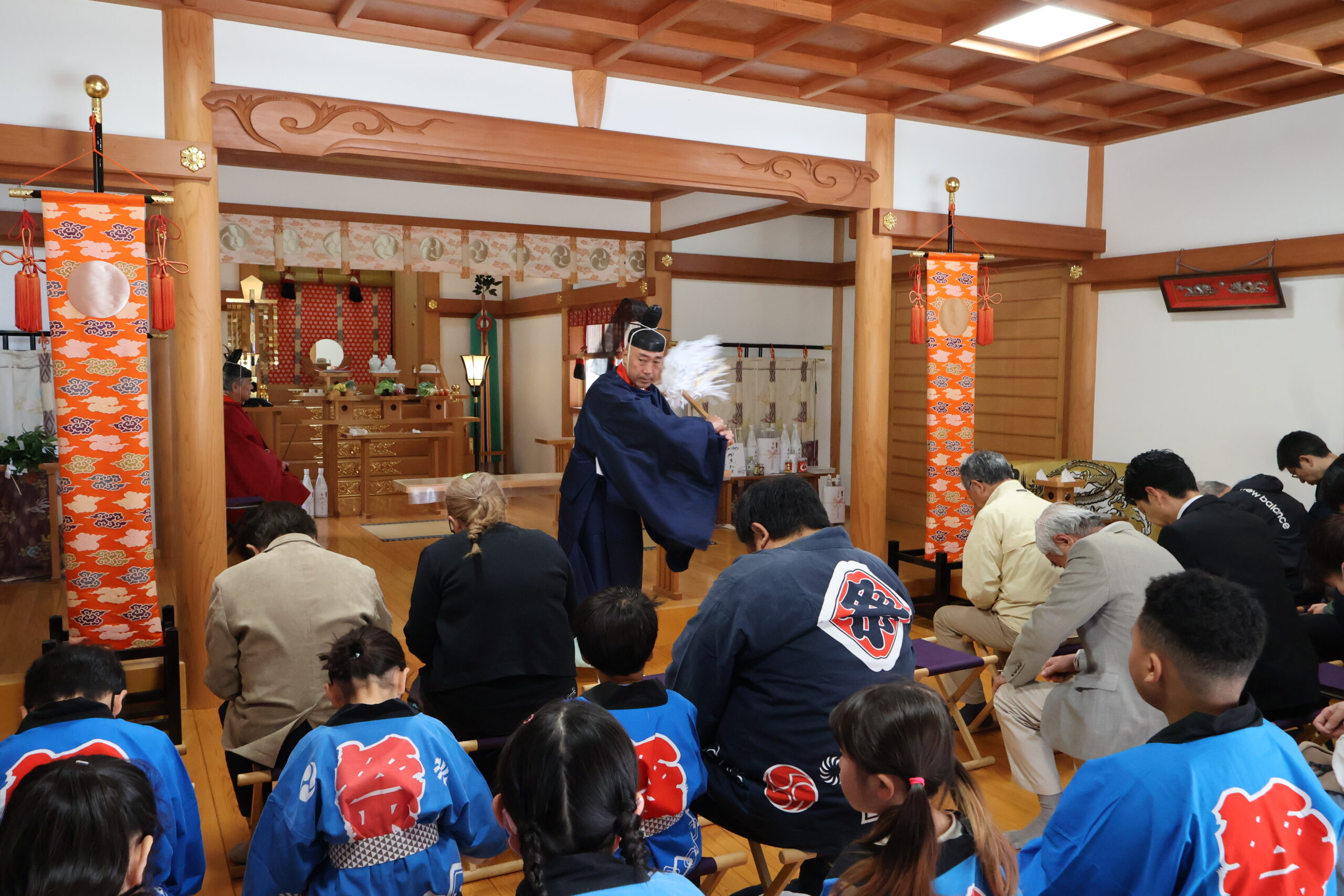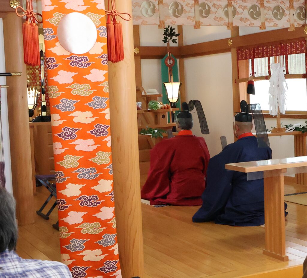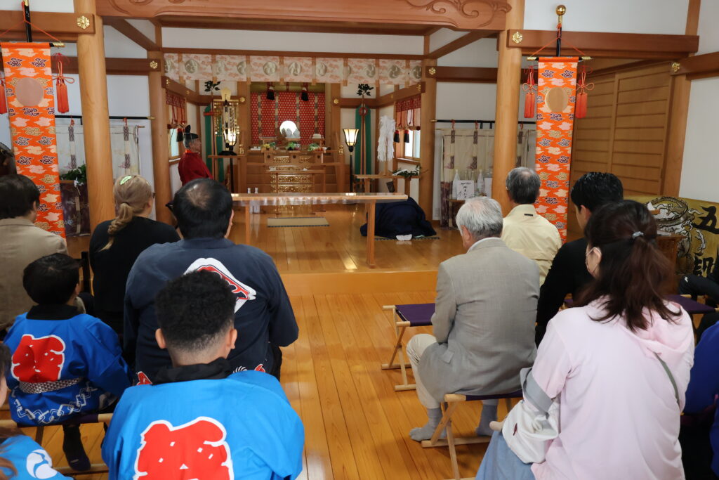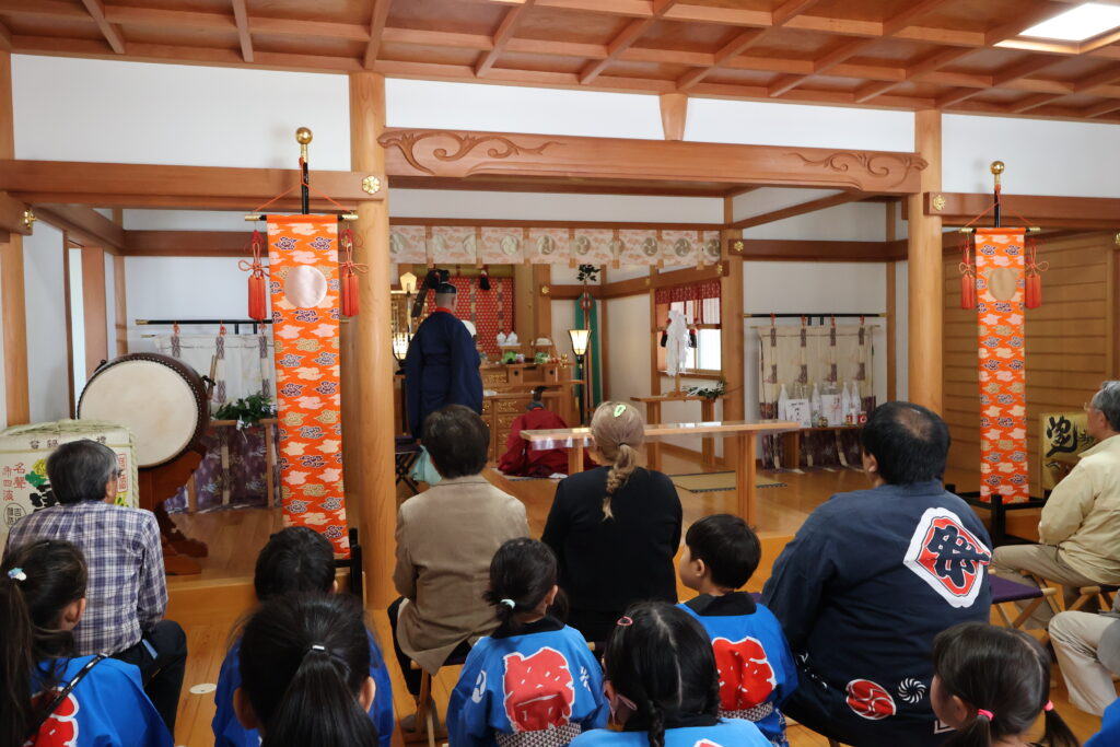 晴天に恵まれ、式典には各団体の方々、地区役員、太鼓の子供たち、その他多くの参列者が同席し、それぞれの代表が玉串を奉奠しました。今回の例大祭で神社の総代が交代することもお知らせしました。