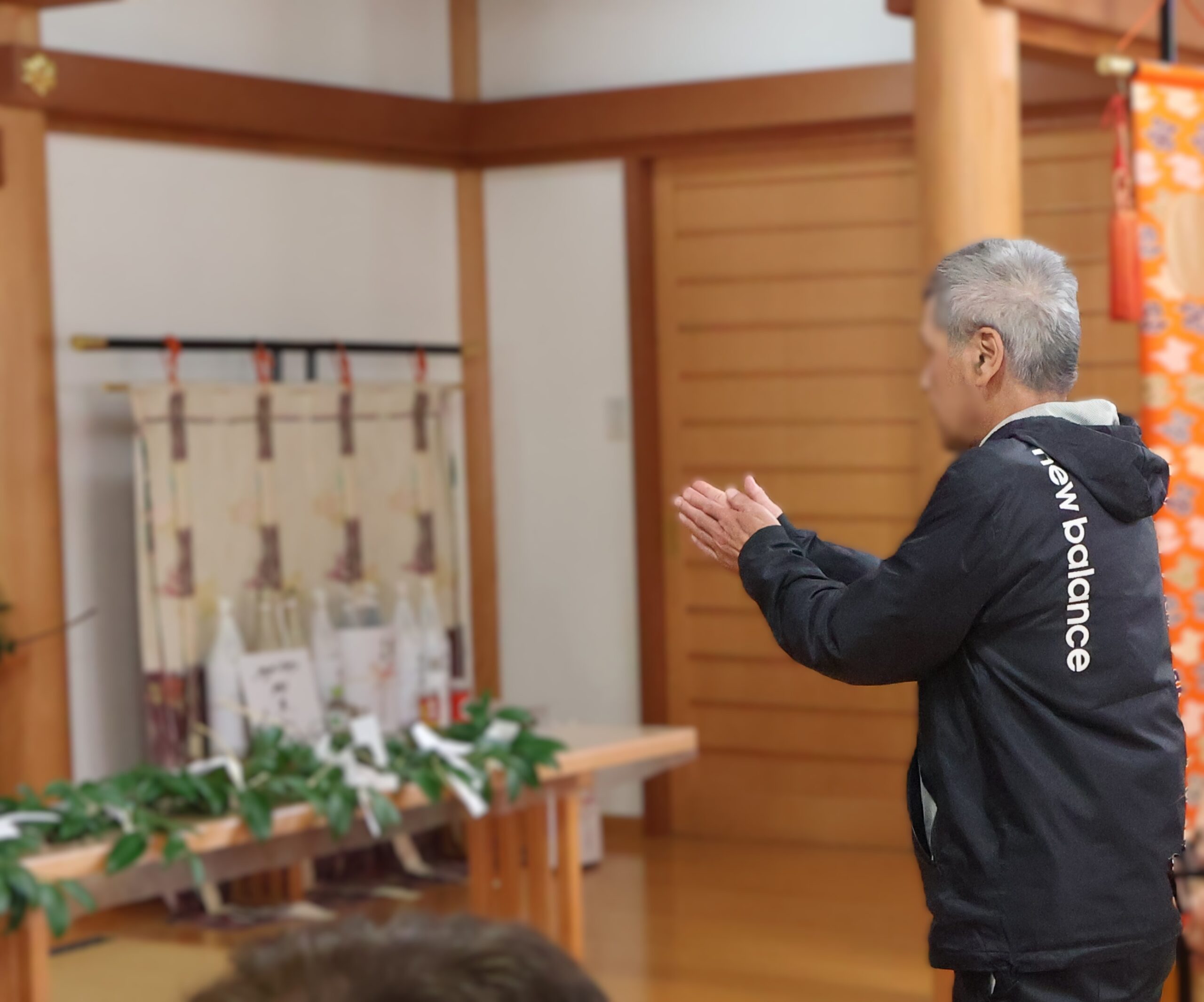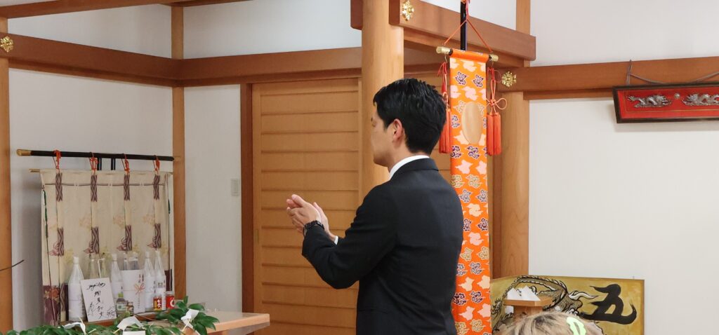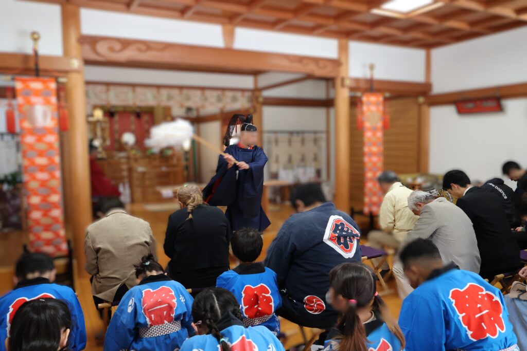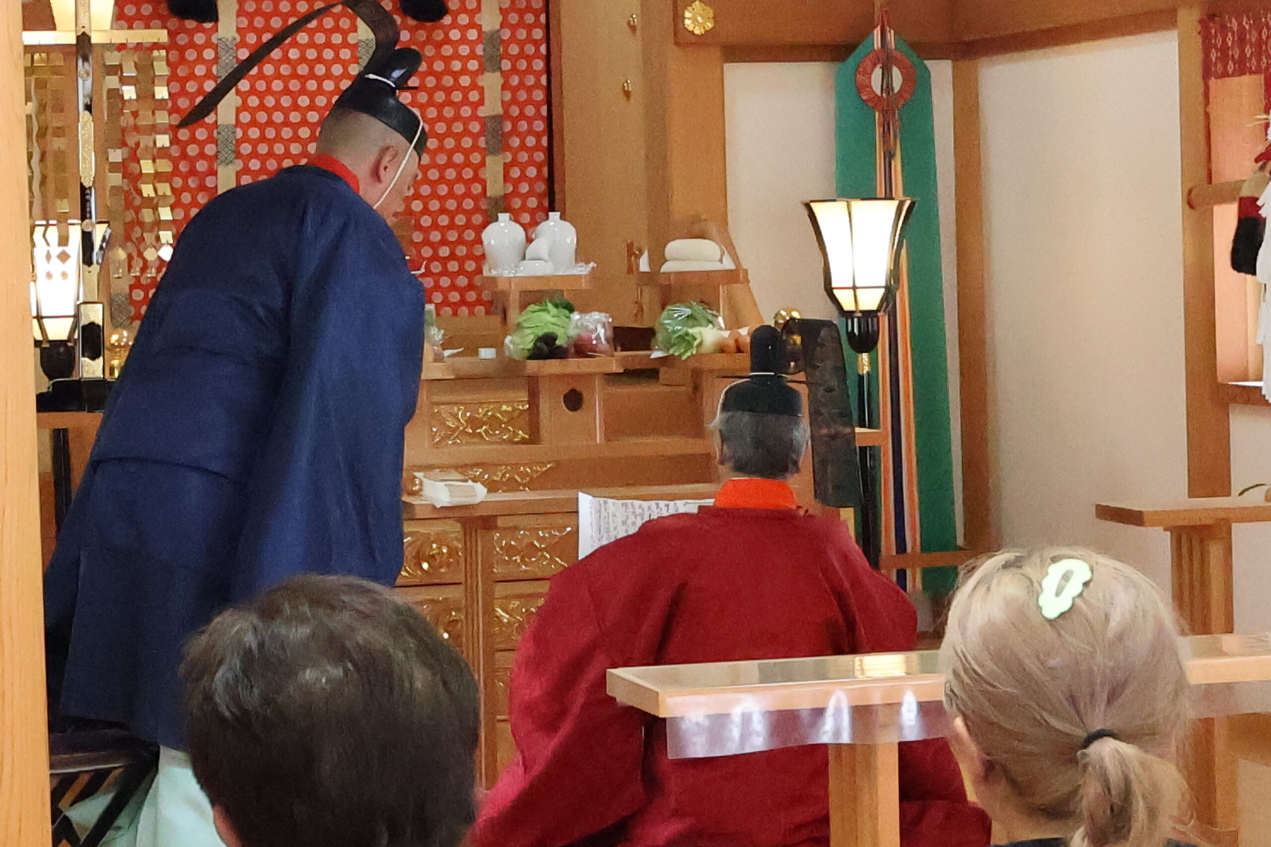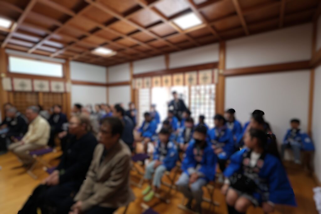 晴天に恵まれ、式典には各団体の方々、地区役員、太鼓の子供たち、その他多くの参列者が同席し、それぞれの代表が玉串を奉奠しました。今回の例大祭で神社の総代が交代することもお知らせしました。