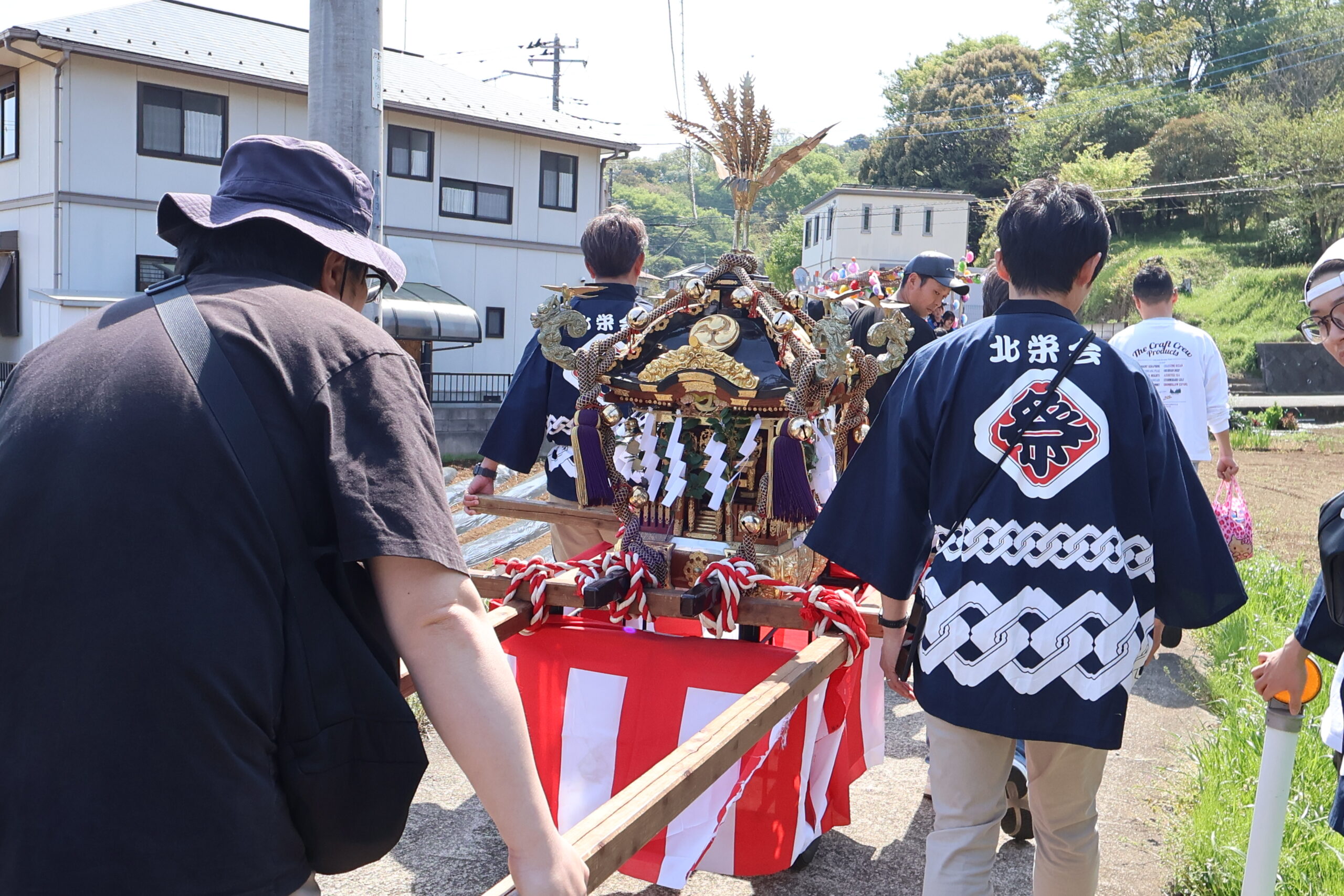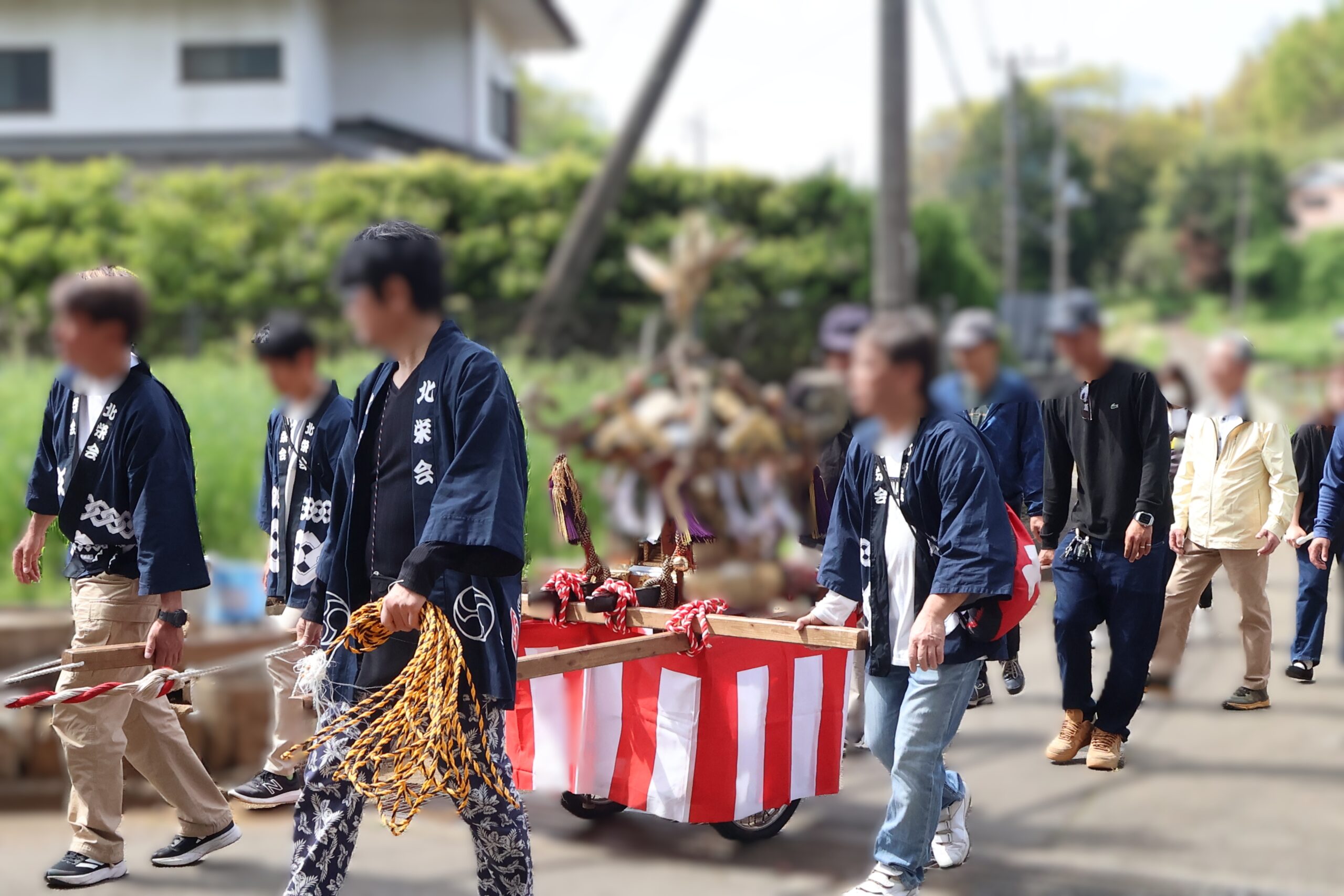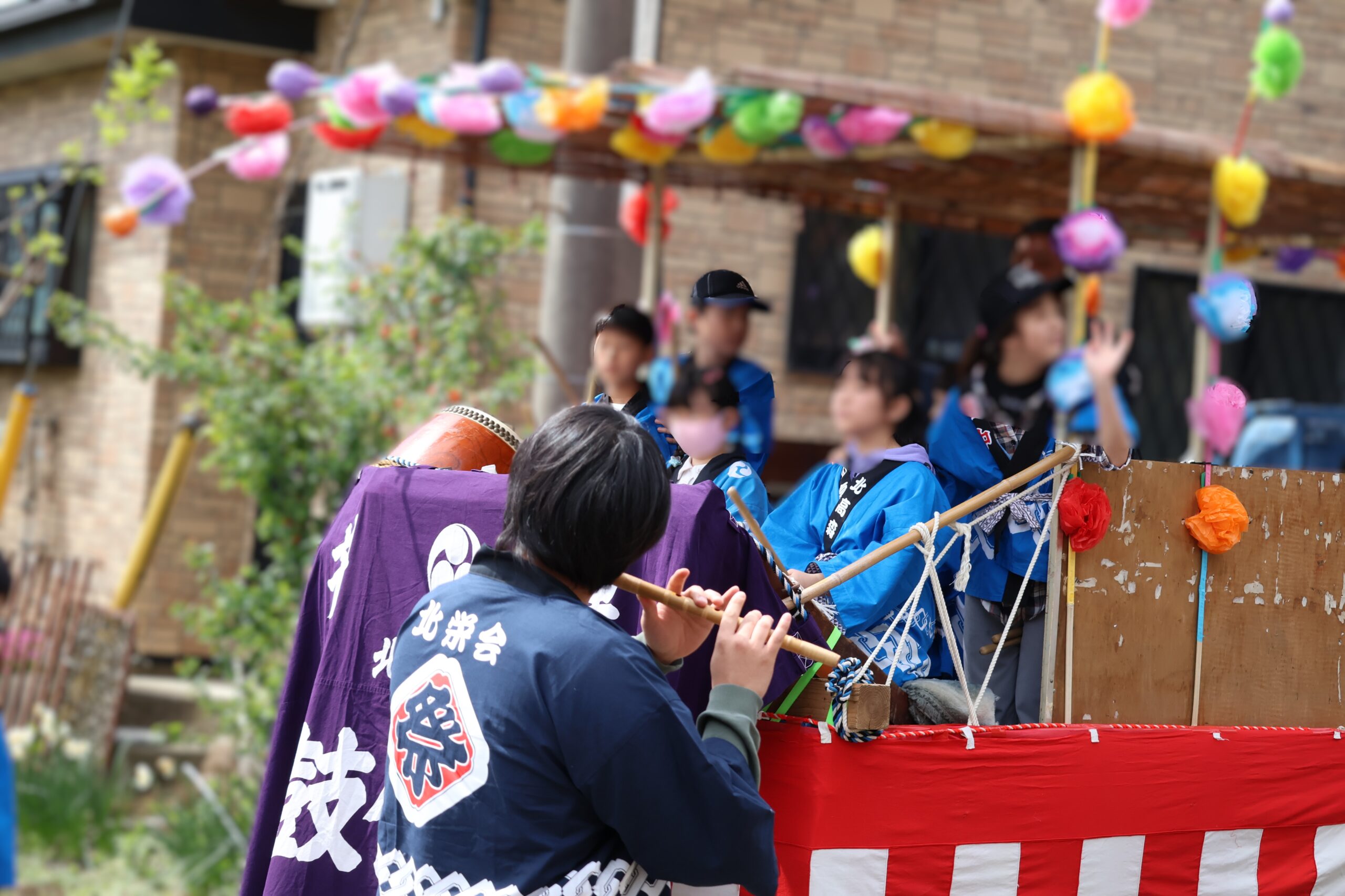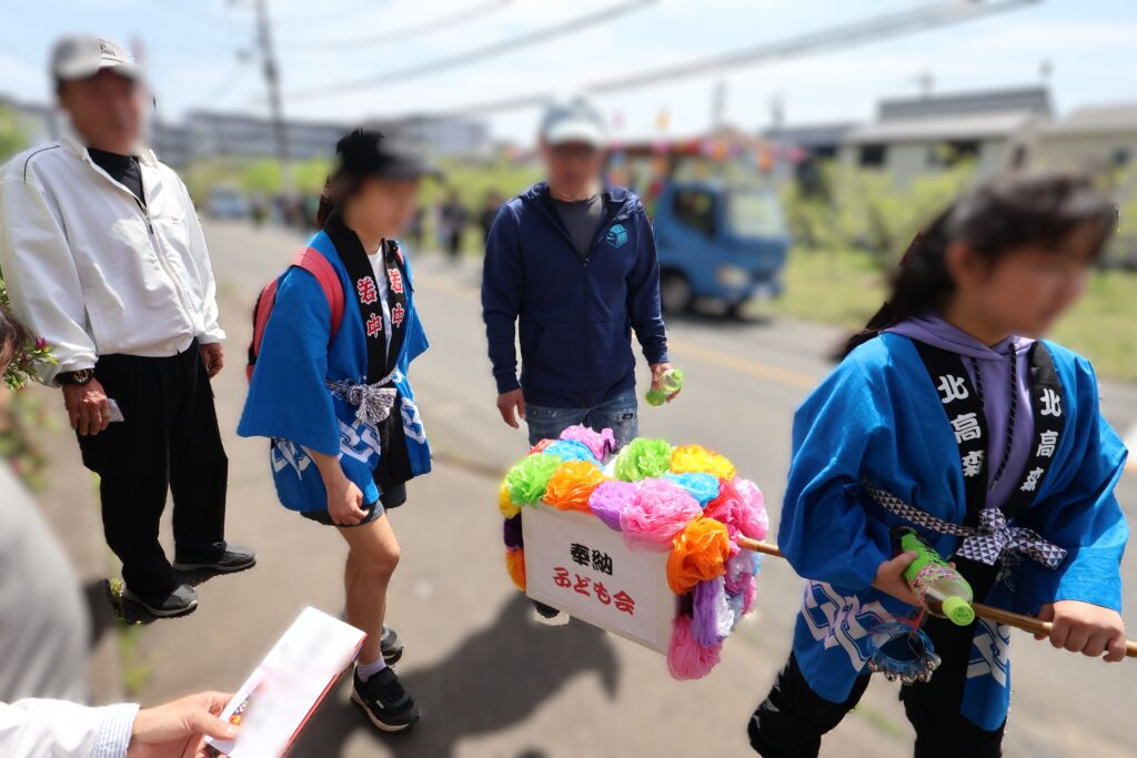 子供たちの太鼓や大人の笛太鼓とともに、今回は子供たちが神輿が曳いて北高森地区を渡御しました。最初に祭り囃子が現れ、次に力を合わせて綱を曳く子供たちが続き、次に保護者たちが御輿を乗せたリヤカーを押して、進んでいく様は実に壮観です。音響効果抜群の太鼓は、北栄会太鼓部がご指導され、練習の成果(練習日は7日間)を発揮し地域を元気にします。太鼓の音が聞こえてくると家の中から家族が出てきて、声をかけてくれます。おひねり箱を持った子供たちは軽快に動き地域を盛り上げます。一日中素晴らしい音色の笛を演奏してくださった方々お疲れ様でした。
