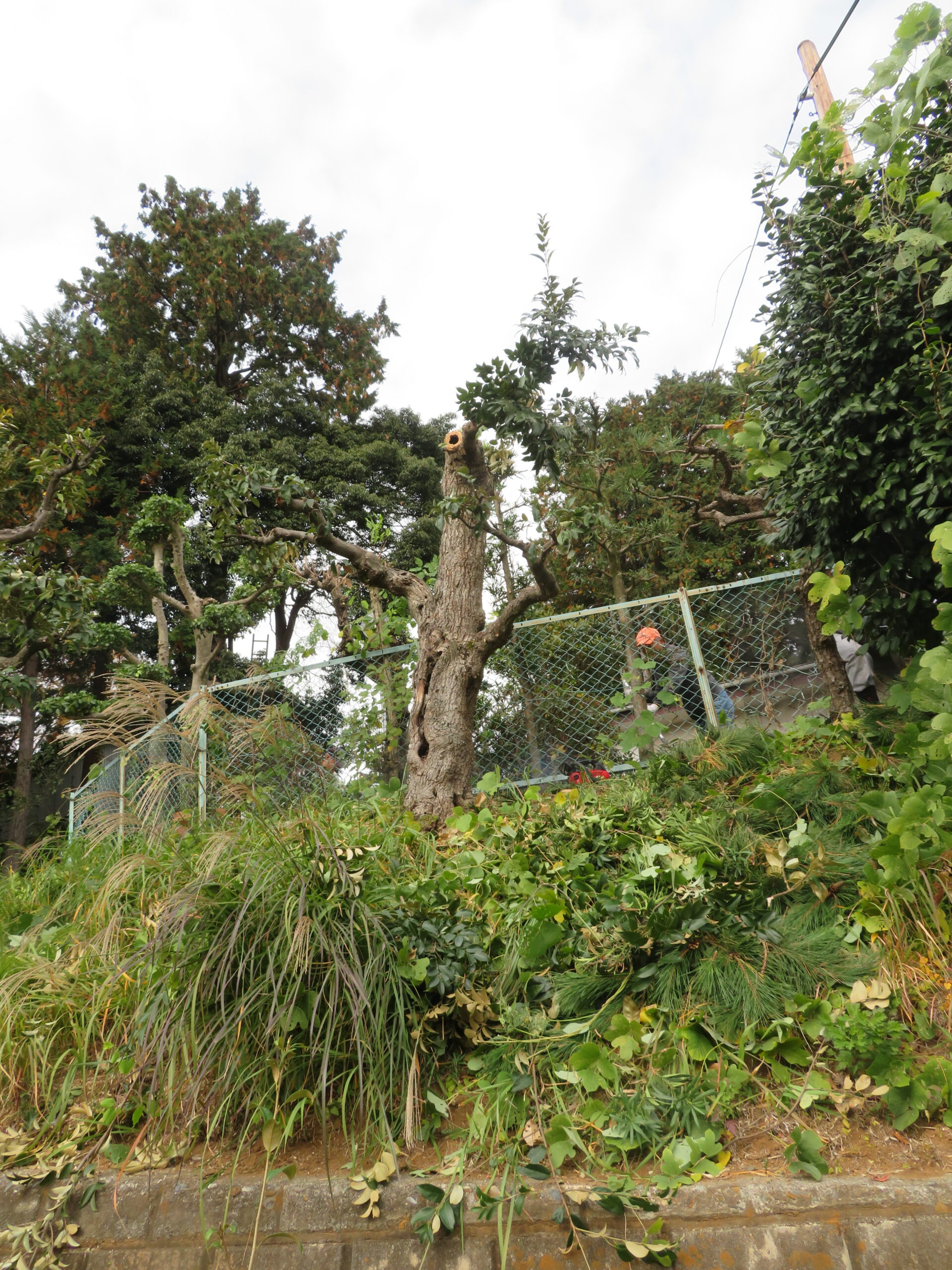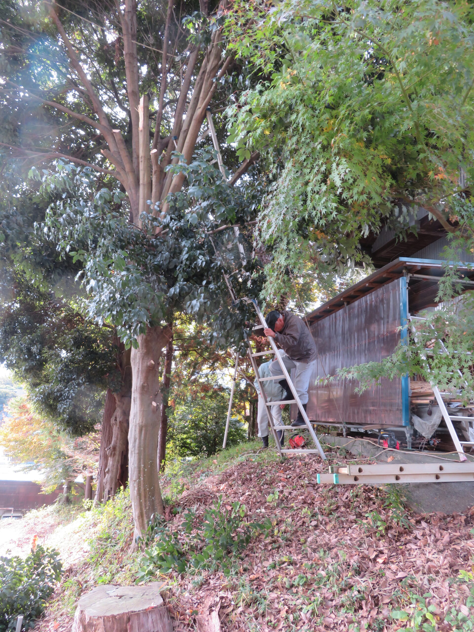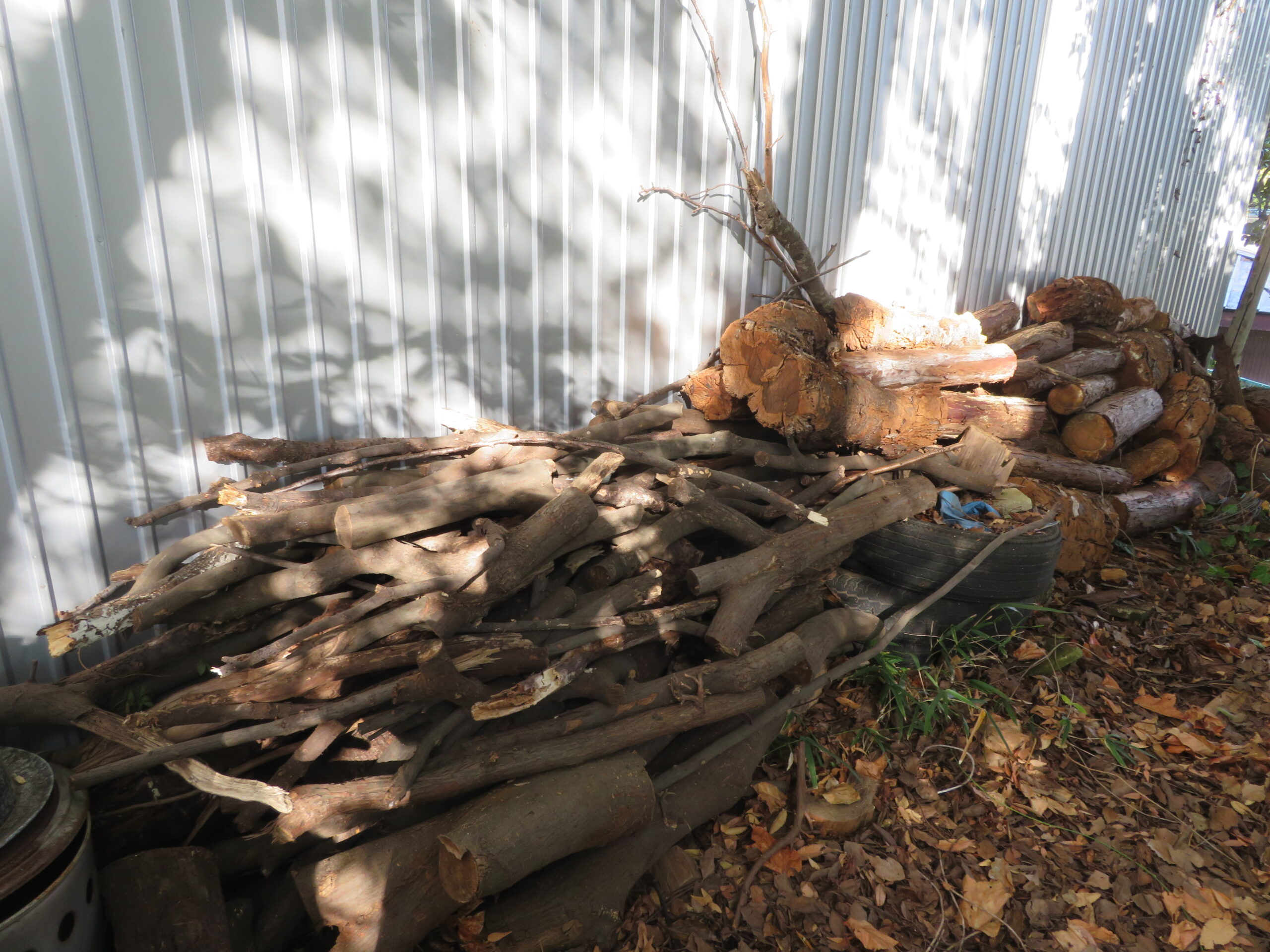 年末年始の焚火に使う薪が枝下ろしの副産物として保存され、暖をとる準備ができました。