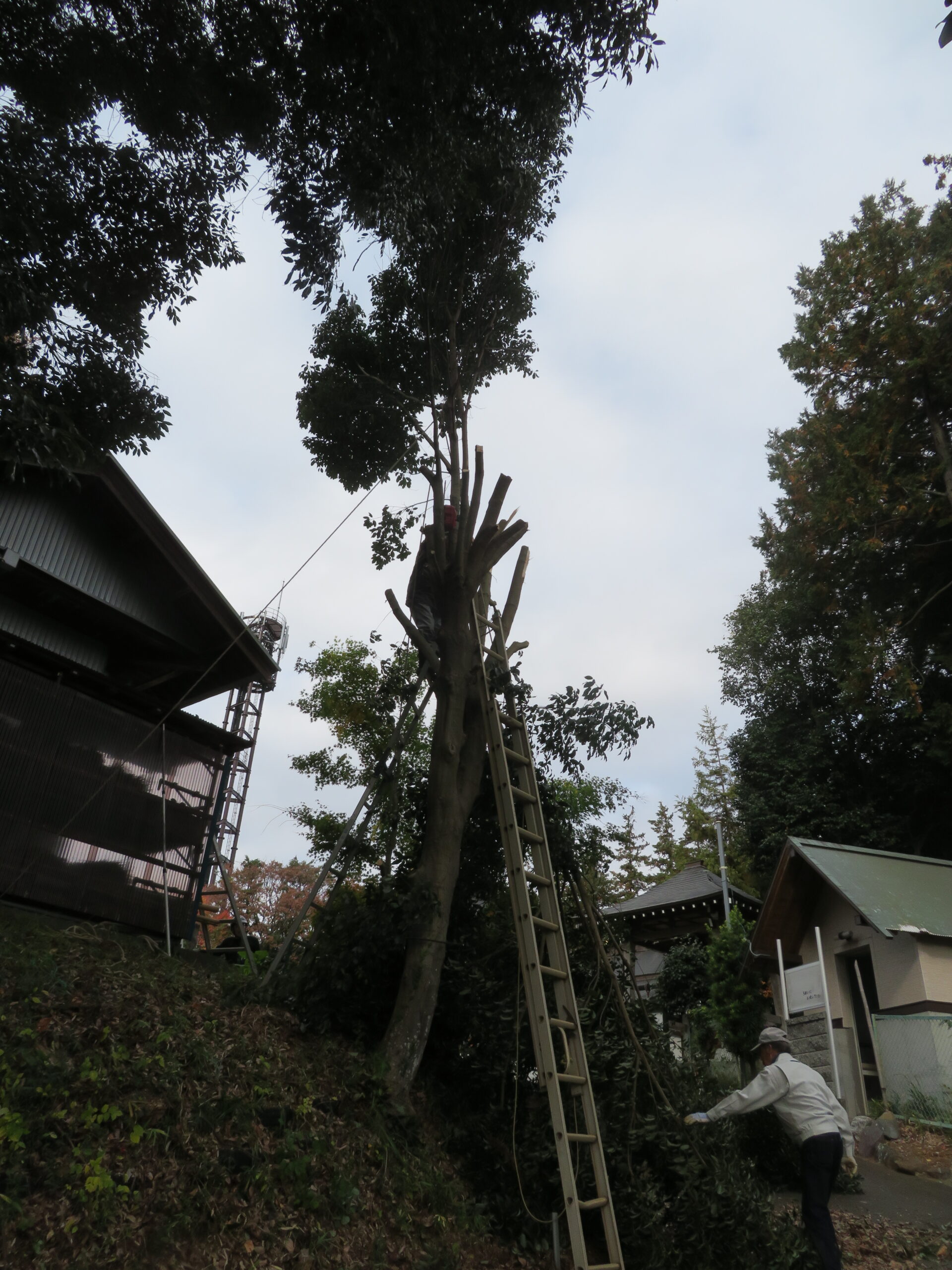 神楽殿の側のシイの木は、熟練した技術を持った方々により枝下ろしが行われました。作業後は、児童館の横の坂を登っていく途中に大きな空を背景に神楽殿の姿が見えるようになりました。