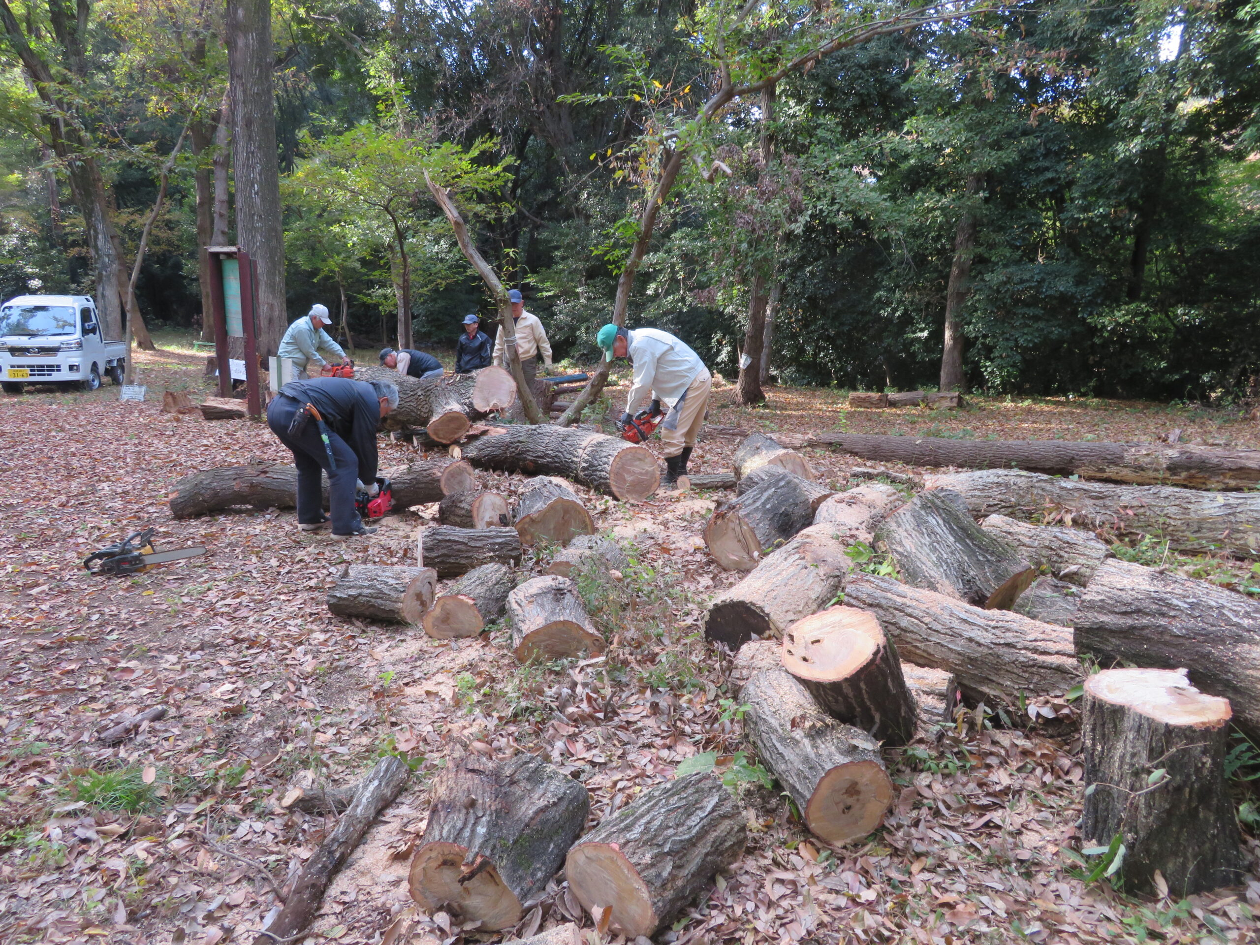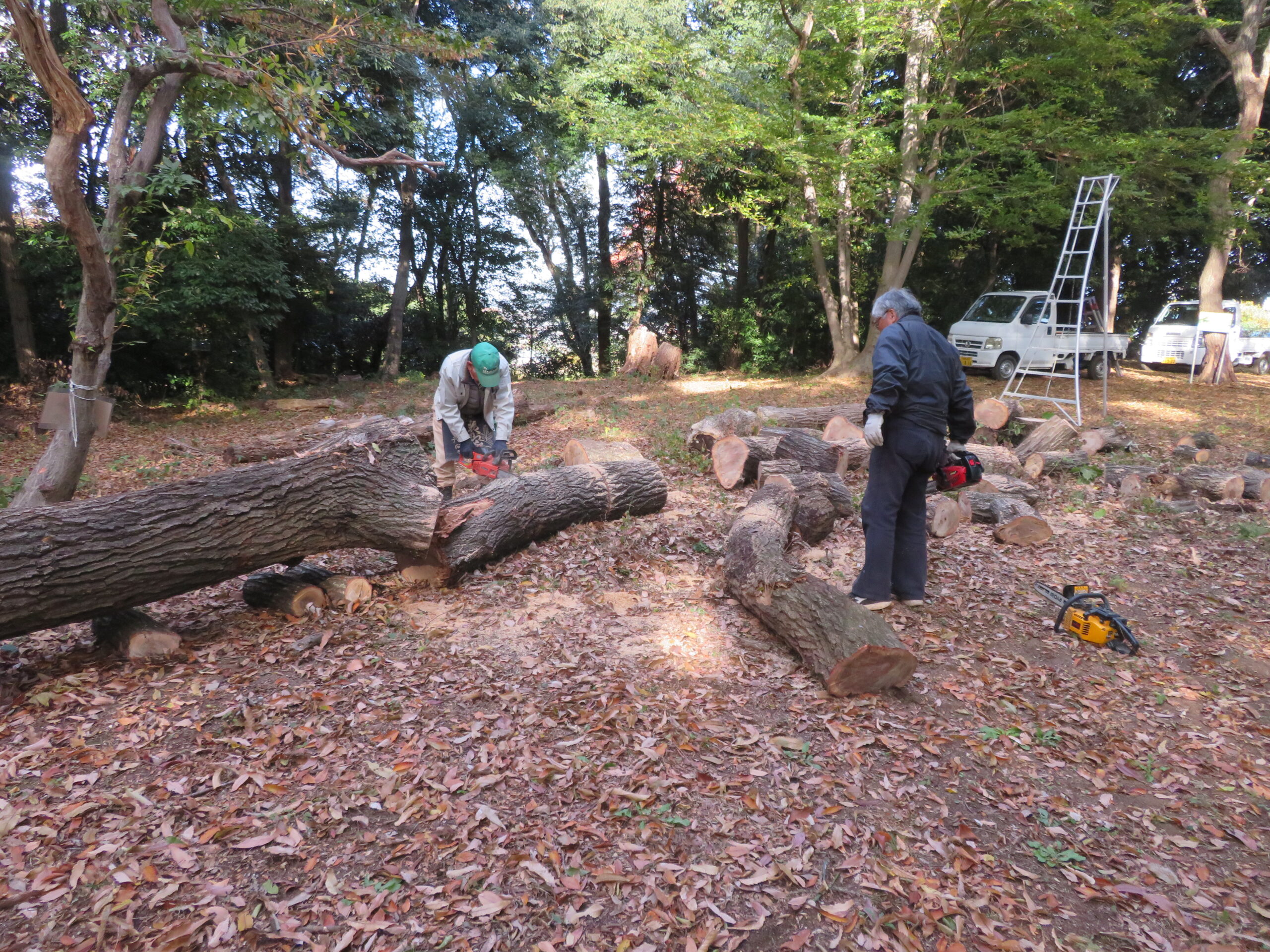 午後からは、森の広場(吾妻神社参道隣接)に倒れている巨木を、チェーンソーの熟練者の方々が処分しました。幹が太いため切断するのに容易でなかったことや切り取った丸太が重いため運搬が大変だったことなど、大変お疲れ様でした。